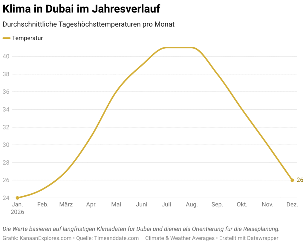 Die Grafik zeigt deutlich den Unterschied zwischen dem milden Winterklima und dem extrem heißen Sommer in Dubai. Während die Temperaturen zwischen November und März meist angenehm bleiben, steigen sie im Hochsommer häufig über 40 °C.